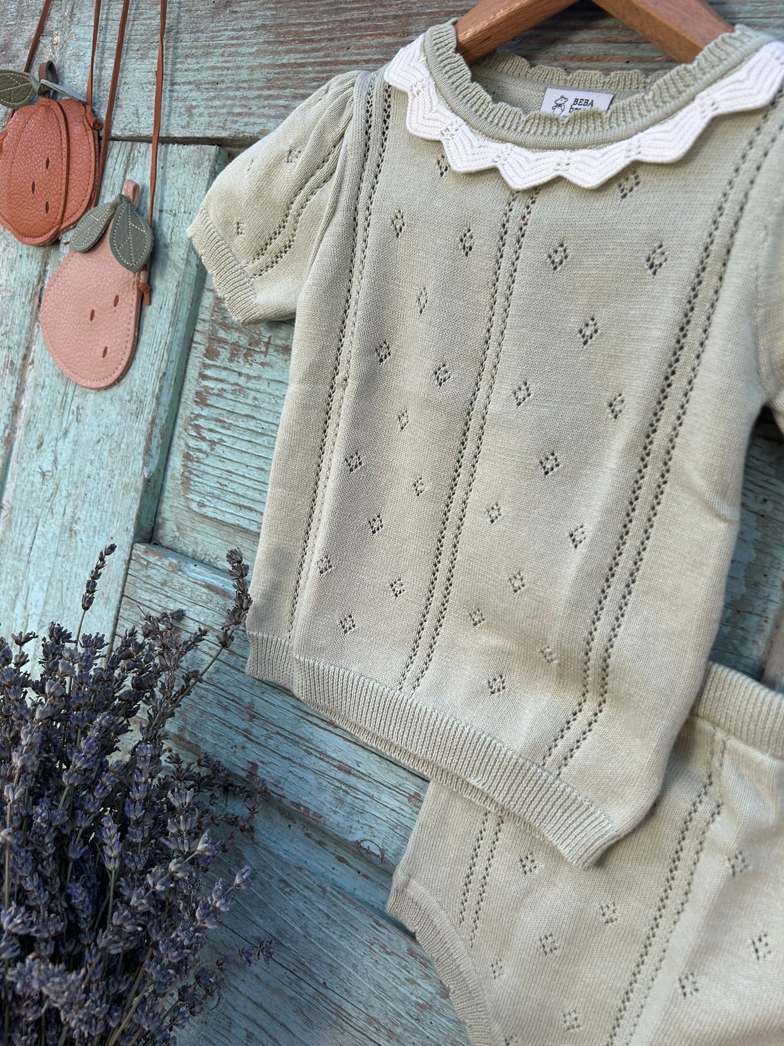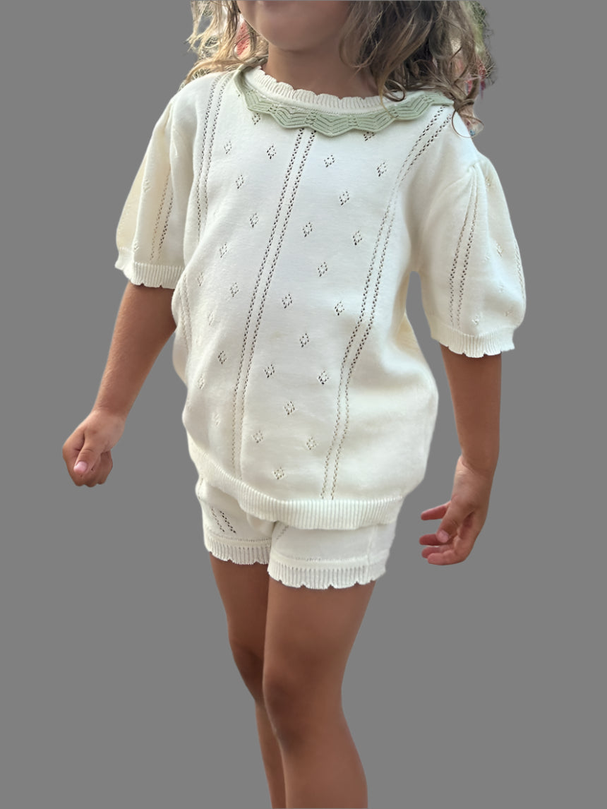 Pamučni set u dve atraktivne boje za leto, majica i šorc sa veženim radom oko vrata i na rubu šorca. Veoma je prijatan i pogodan za sve prilike, jako efektan i mališanima pruža izvanredan konfor pri pokretu.