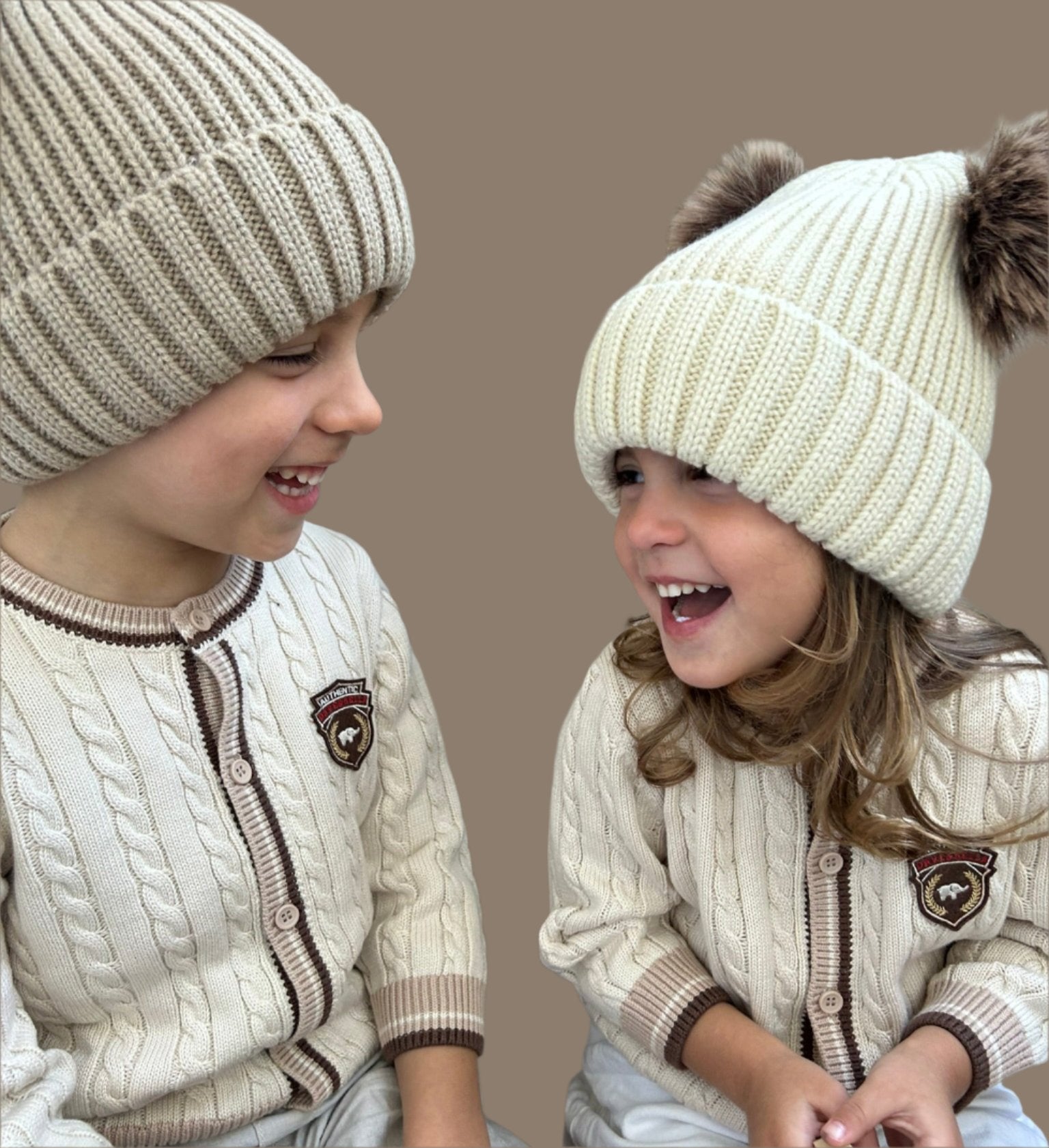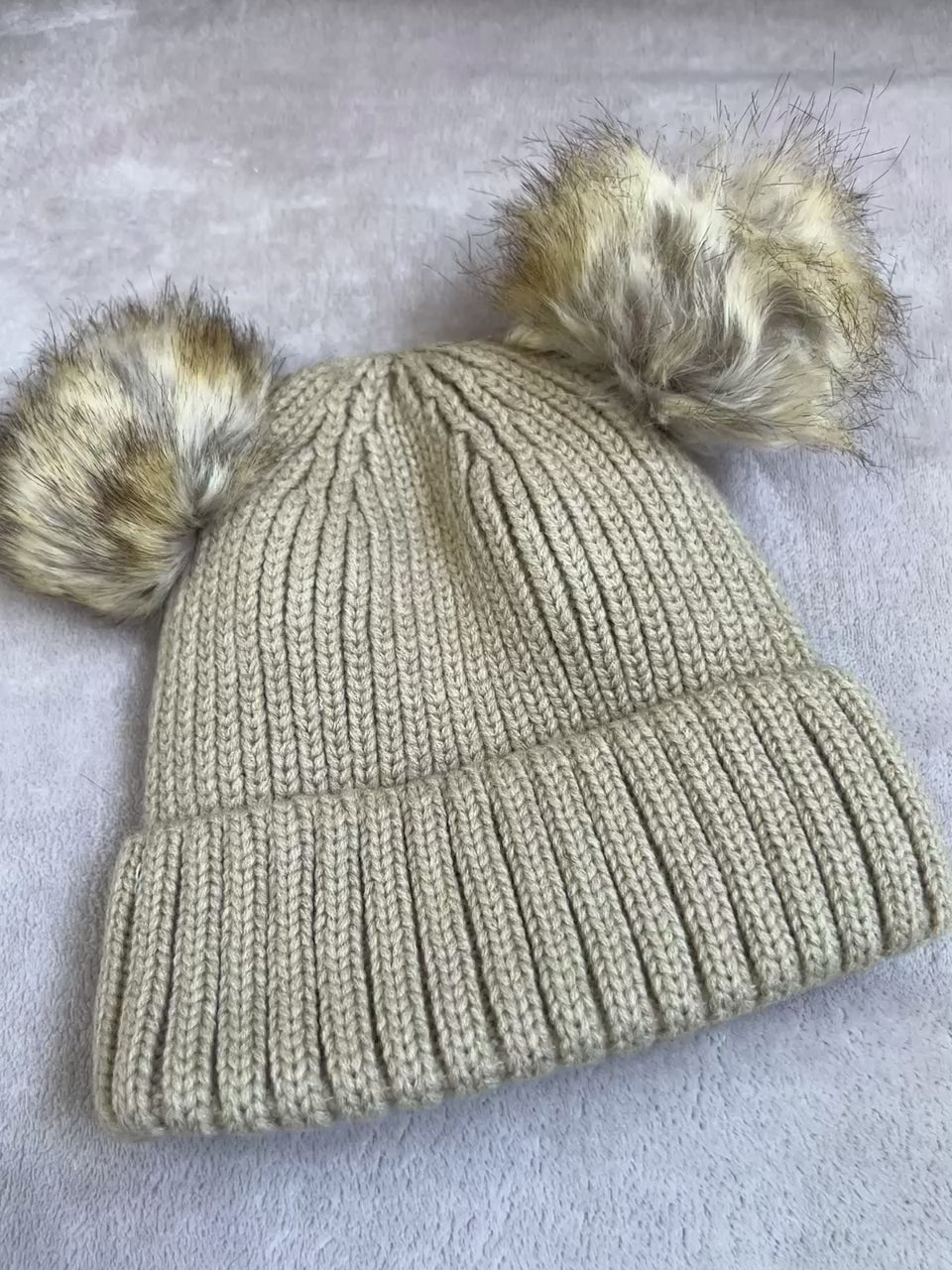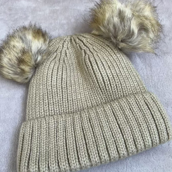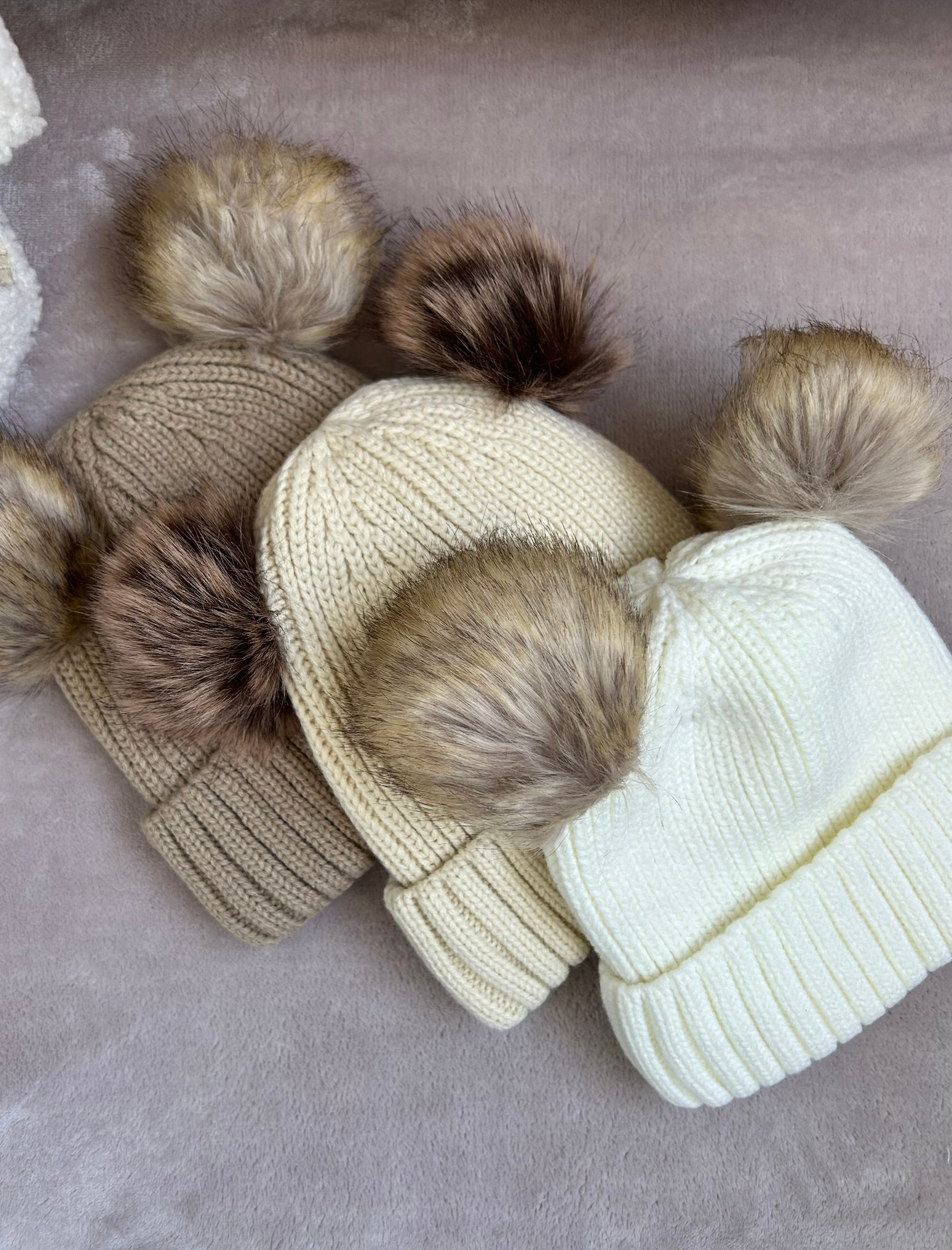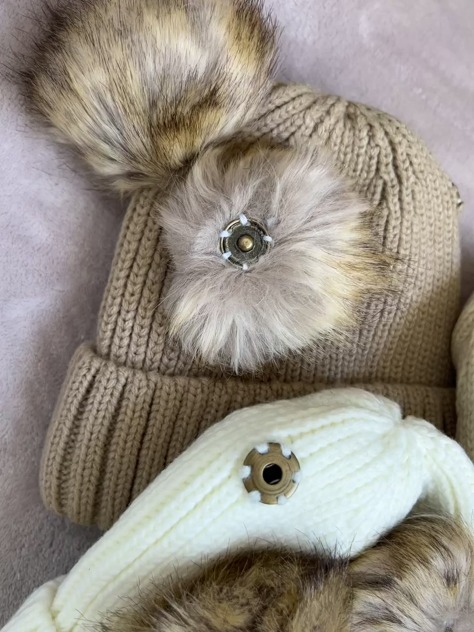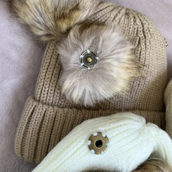 Kape sa pufnicama od krzna u beloj, bež i kafa boji. Dostupne u veličinama od 2-4 godine